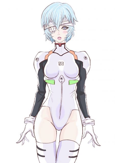 1girladapted costumearms at sidesbandage over one eyebandaged headbandagesblue eyesblue hairblushbracerbreastscowboy shoteyepatchfacing viewerfemale focusglovesgroinhair between eyeshighleghighleg leotardlegs togetherleotardlooking at viewermecha pilot suitpale skinparted lipspink lipsplugsuit (evangelion)purple eyesshort hairsimple backgroundsmall breastssolostandingthigh gapthighhighsturtleneckwhite backgroundwhite leotardwhite thighhighs