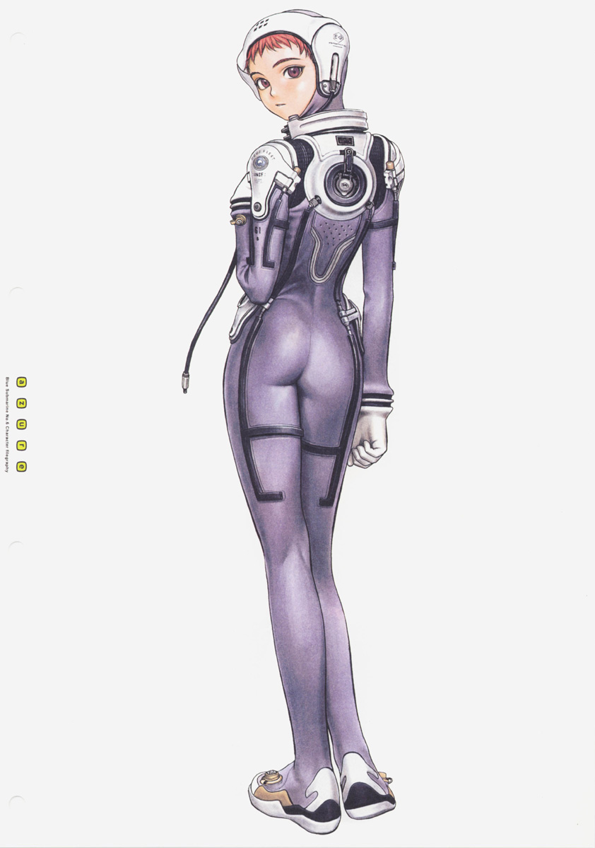 1girlassbodysuitcablediving suitfemale focusfrom behindfull bodyglovesgrey backgroundlegs togetherlooking backpurple bodysuitred hairshort hairsimple backgroundskin tightsolostanding