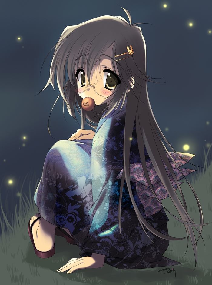 1girlfemale focusfull bodyglassesjapanese clotheskimonolong hairmouth holdoutdoorsplantround eyewearsittingsolowater