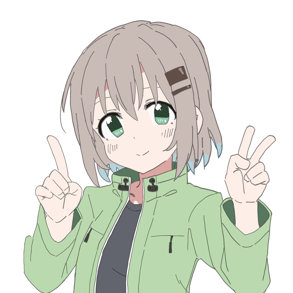 1girlblack shirtblushclosed mouthcollarbonefeet out of framefemale focusgreen eyesgreen jacketgrey hairhair between eyeshair ornamenthairclipjacketlooking at vieweropen clothesopen jacketshirtshort hairsimple backgroundsmilesolostandingt-shirtupper bodyvwhite background