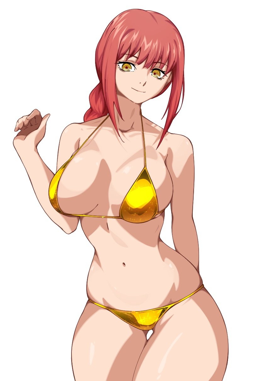 1girlbikinibreastscleavagegold bikinikewpiemayo1729large breastslooking at viewerred hairsimple backgroundsoloswimsuitwhite background