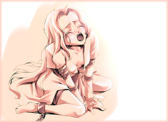 00s1girlbarefootclosed eyescuffsdownblousefemale focuskneelinglong hairmonochromepink themesepiashacklessolotearsthigh strap