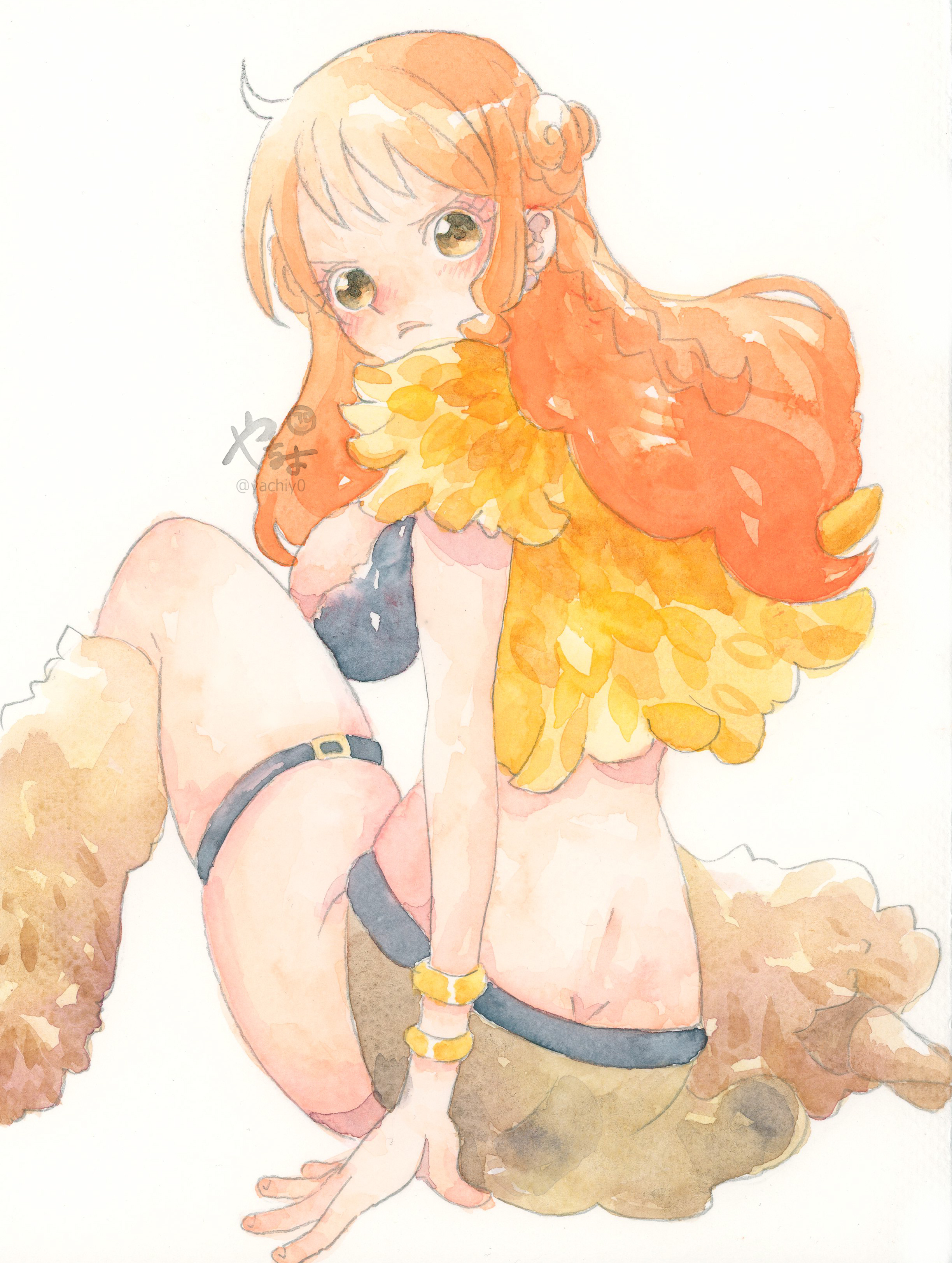 1girlbangleblushbraceletbraidbreastsbrown eyesbrown loinclothbrown skirtbutt crackcapeletclosed mouthcrop topearringsfeet out of framefrom behindfur trimfur-trimmed capeletjewelryknee uplarge breastsleg warmersloinclothlong hairlooking at viewerlooking backminiskirtofficial alternate costumeorange hairpearl earringssignaturesittingskindentationskirtsolothigh straptwitter usernameyellow capelet