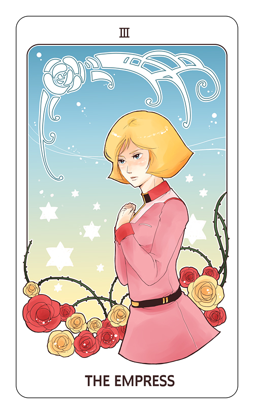 1girlblonde hairblue eyescard (medium)female focusflowerplantsolostar (symbol)tarottarot (medium)the empress (tarot)vines