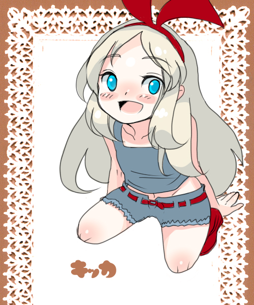beltblonde hairblue eyesblushcollarbonegroinkneelinglolilong hairmidriffnavelno pantiesribbonshortssolotank top
