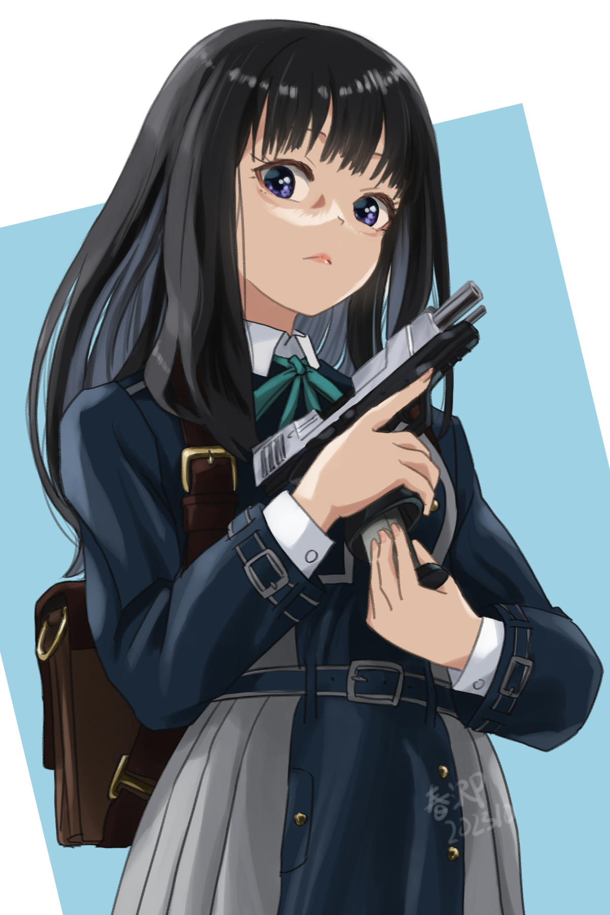 1girlaegyo salbagblack hairblue eyesclip (weapon)dateddisgustgunhandgunholdingholding gunholding weaponlong hairlong sleeveslooking at viewerreloadingschool bagschool uniformsimple backgroundsoloweapon
