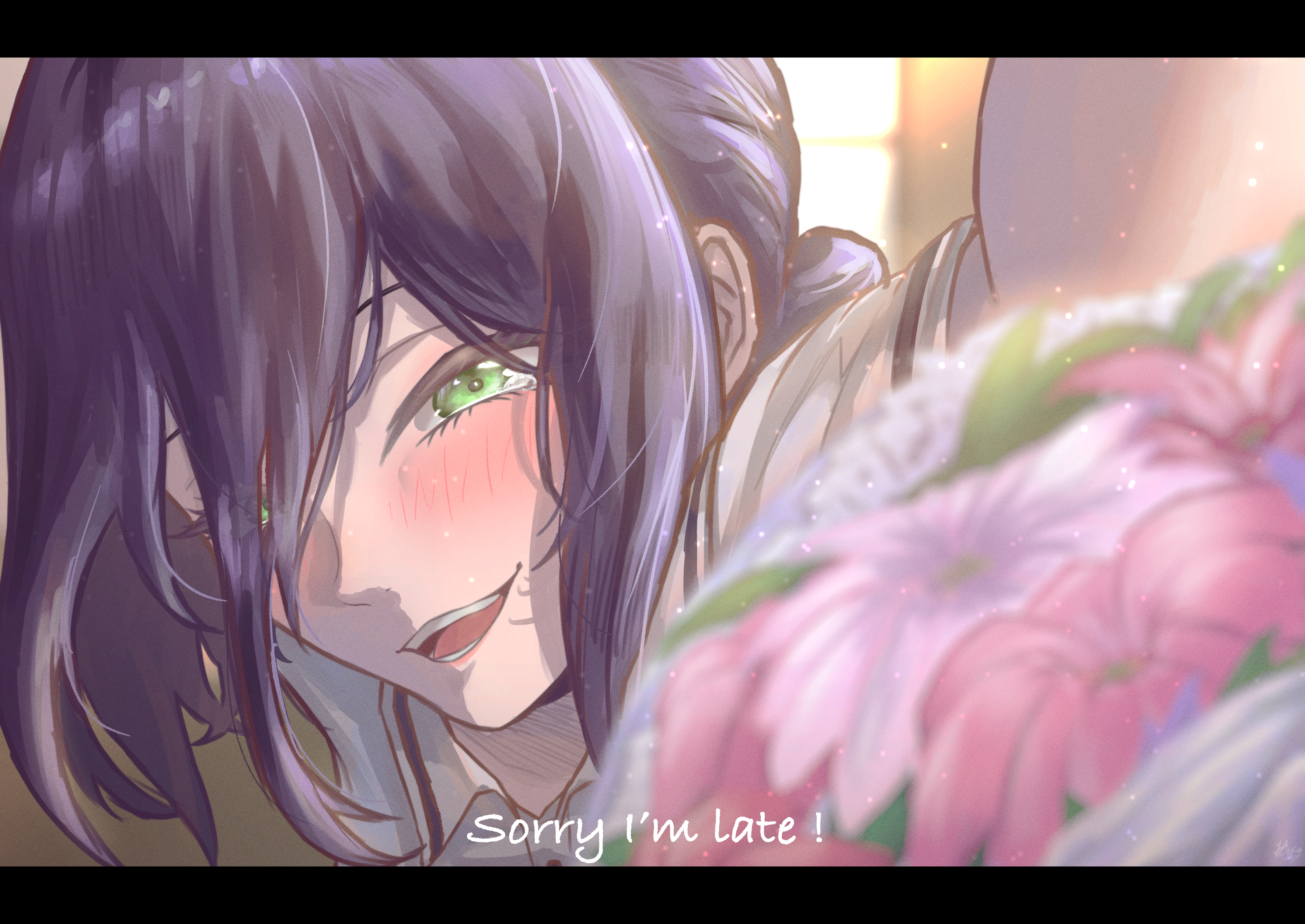 1girlblack hairblushbouquetflowergreen eyeslooking at vieweropen mouthpolo shirtshirtsolotearing upteethwhite shirt