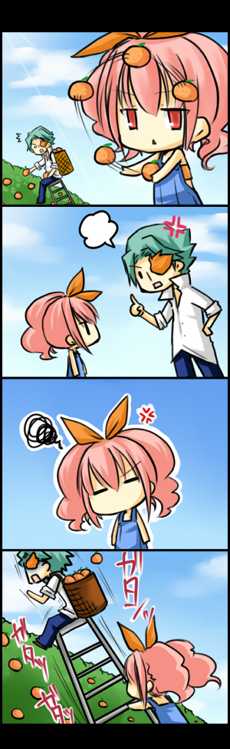 00sanger veincomicfarmfoodfruitgreen hairjugglingladdermaskorange (fruit)orange eyesorange farmorchardpink hairpoutribbontree
