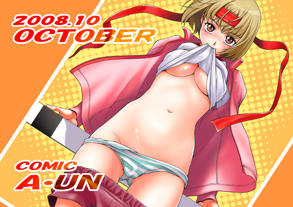 1girlblushbreastsbrown eyesbrown hairclothes liftclothes pullfemale focusheadbandjacketmedium breastsmouth holdno brapantiespanty pullshirt liftshort hairshortsshorts pullsolostriped clothesstriped pantiesunderboobunderwearundressing