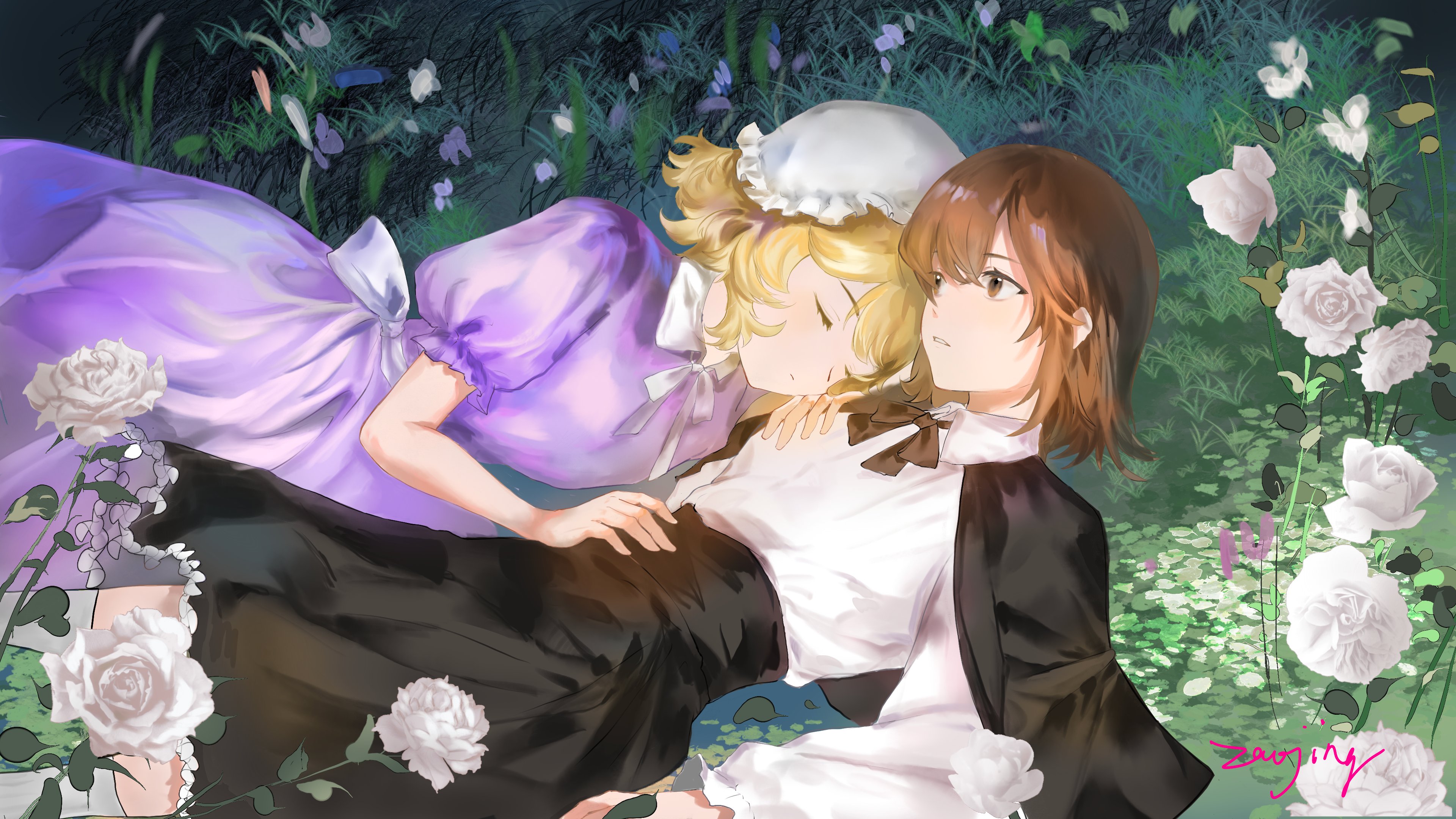 2girlsblack bowblack bowtieblack capeletblack skirtblonde hairbowbowtiebrown eyesbrown haircapeletclosed eyesclosed mouthcollared shirtcowboy shotcurly hairdresseyebrows hidden by hairflowerfrilled dressfrilled shirtfrilled skirtfrillshand on another's chesthand on another's shoulderhathead on another's shoulderhead on handkneehighslong sleeveslyingmob capmultiple girlsneck ribbonno headwearon backon grasson sidepurple dressribbonroseshirtshort hairsignatureskirtsleepingsockssunlightteethwaist bowwhite bowwhite flowerwhite hatwhite rosewhite shirtwhite socksyuri