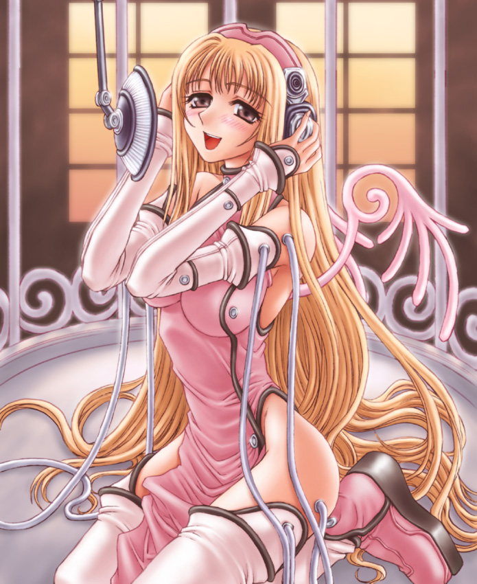 1girlblonde hairblushbrown eyesfemale focusheadphoneslong hairmicrophonemusicsingingsolothighhighsvery long hairwings