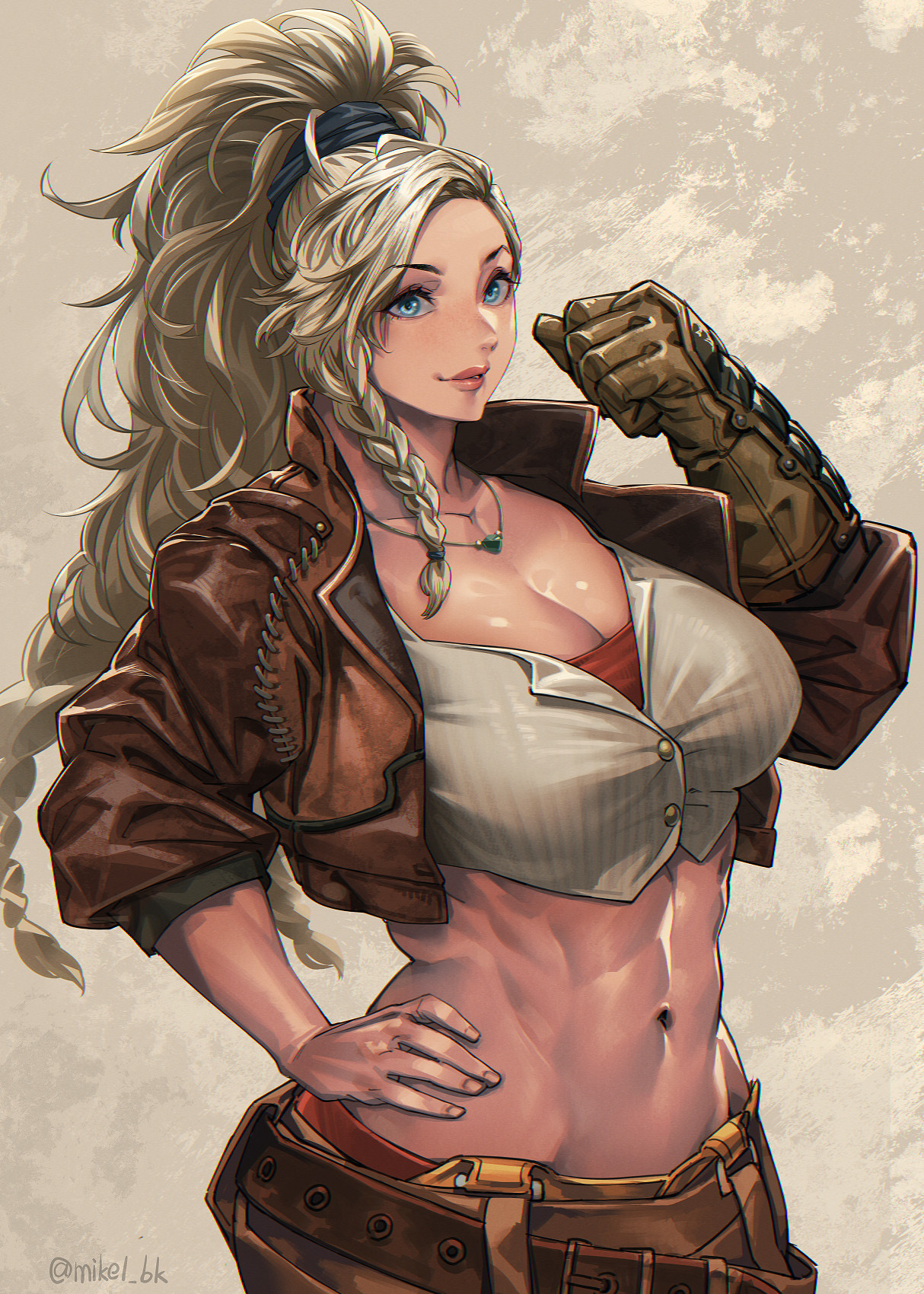 1girlabsbeltblonde hairblue eyesbraidbreastsbrown beltbrown glovesbrown jacketcleavagecropped jacketgloveshand on own hipjacketjewelrylarge breastslong hairlooking at viewermidriffnavelnecklaceponytailside braidsingle glovesmilesolostomachtonedtoned female