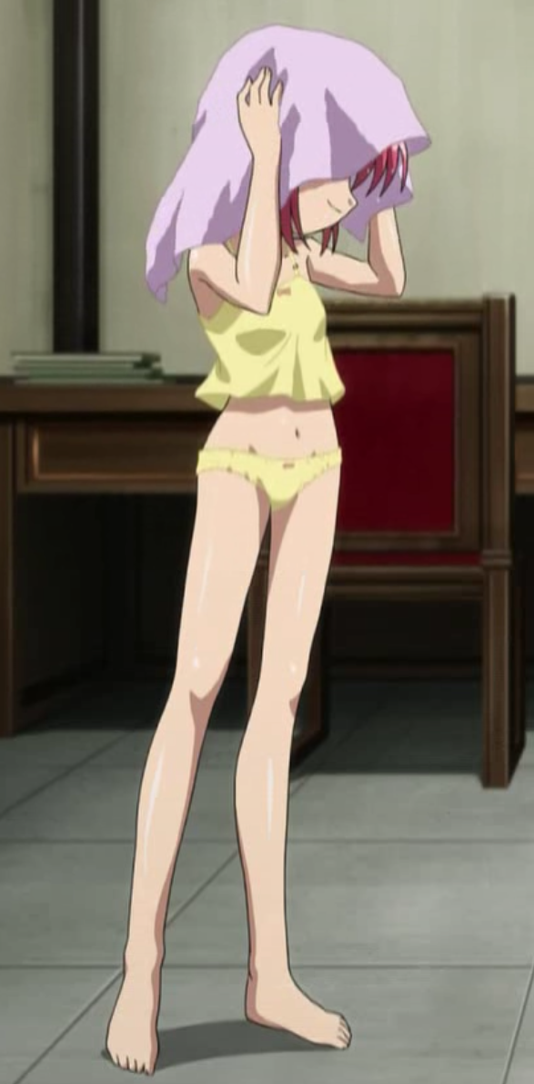 00s1girlbarefootcamisolefemale focusflat chestlingerielong legsmidriffnavelpantiesred hairshort hairsolotoweltowel on headunderwear