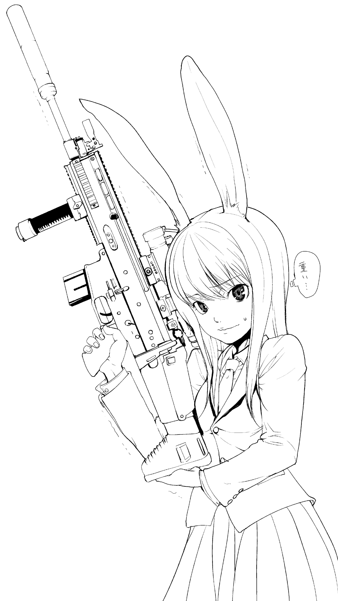 1girlanimal earsassault riflefemale focusfn scargreyscalegunmonochromerabbit earsriflesolosuppressorweapon