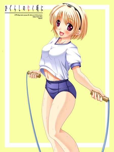 00s1girlblonde hairblushbreastsburumafemale focusgym uniformhairbandholdingholding jump ropejump ropenavelpurple eyesshort hairsmilesolosweat
