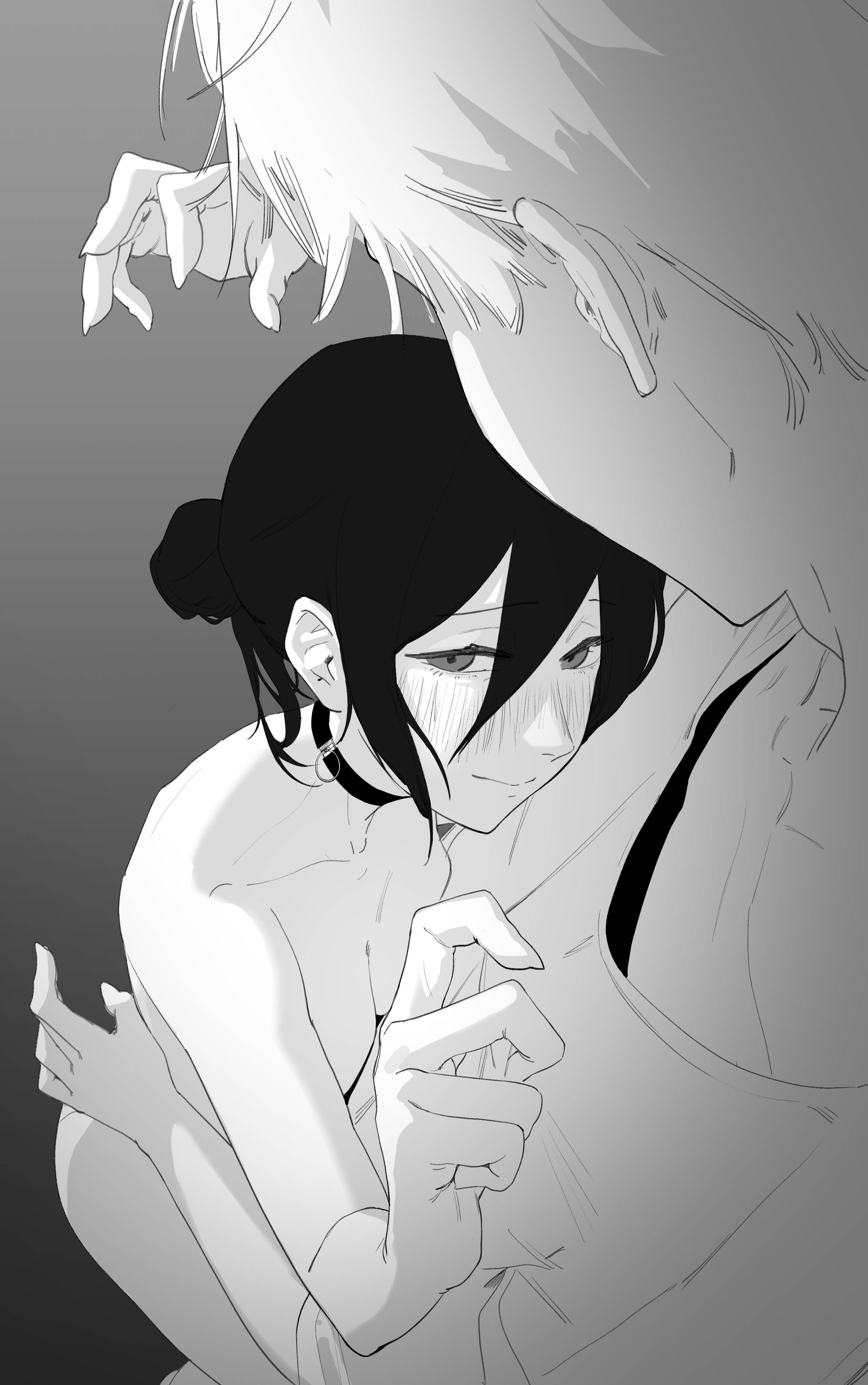 1girlblushchokerclosed mouthclothed male nude femalefrom abovegrenade pingreyscalehair between eyeshair bunheteromonochromenudeshirtshort hair