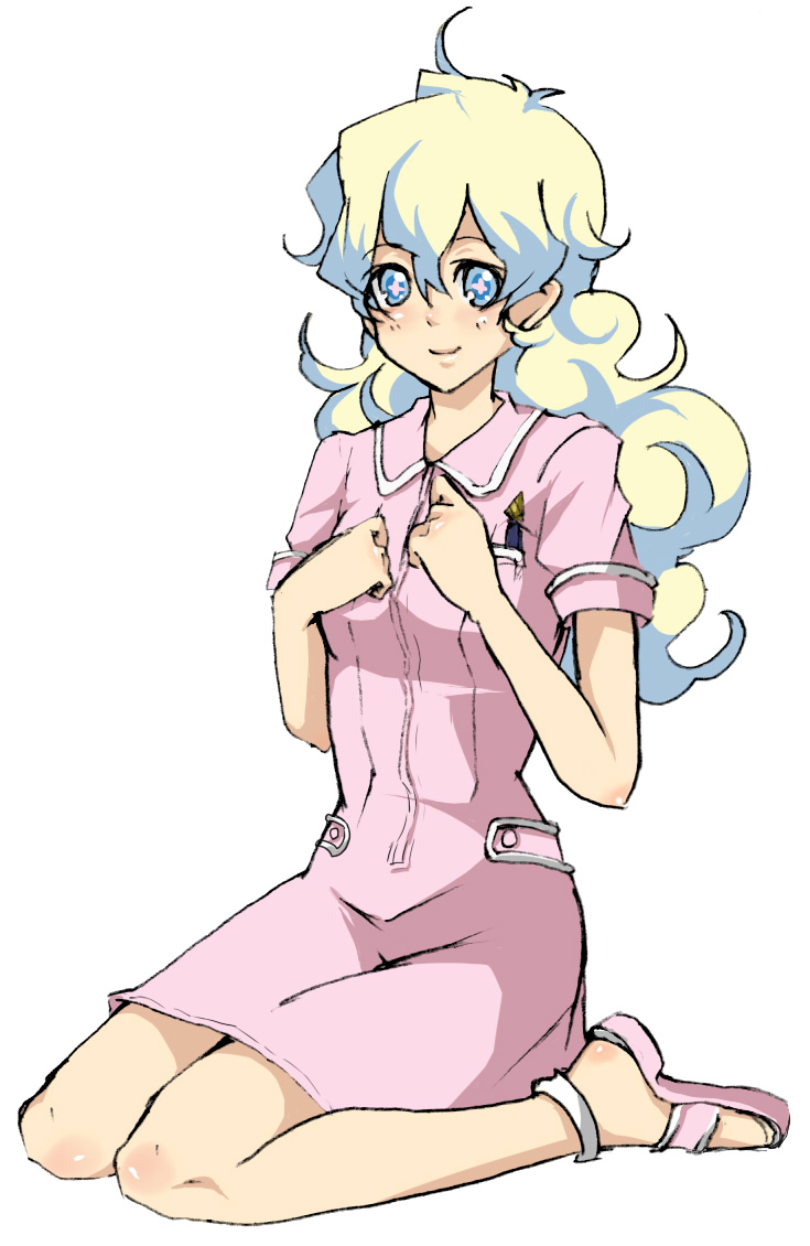 sugar (sugarless), ema skye, ace attorney, apollo justice: ace attorney, capcom, 1girl, adjusting eyewear, brown eyes, brown hair, half updo, lab coat, lipstick, long hair, makeup, smile, sunglasses, sunglasses on head, watch, wristwatch