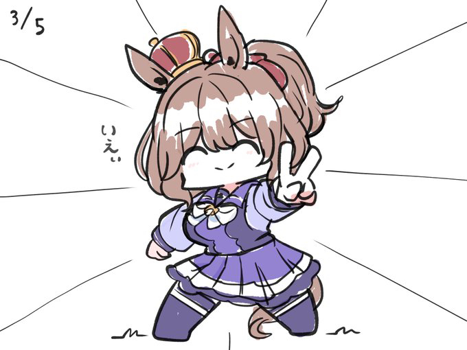 1boy1girlbowbrown hairchibiclosed eyesclosed mouthcrownemphasis linesfacing viewerfull bodyhair between eyeshorse girllong sleevesmini crownone side upoutstretched armpleated skirtpuffy long sleevespuffy sleevespurple shirtpurple skirtpurple thighhighsschool uniformshirtskirtsolostandingthighhighstracen school uniformvwhite backgroundwhite bow