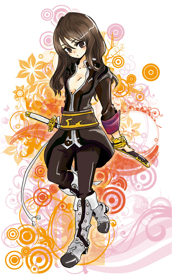 00s1girlbootsbreastsbrown eyesbrown haircleavagegenderswapgenderswap (mtf)grey bootskatanaknee bootslong hairmedium breastsswordwarriorweapon