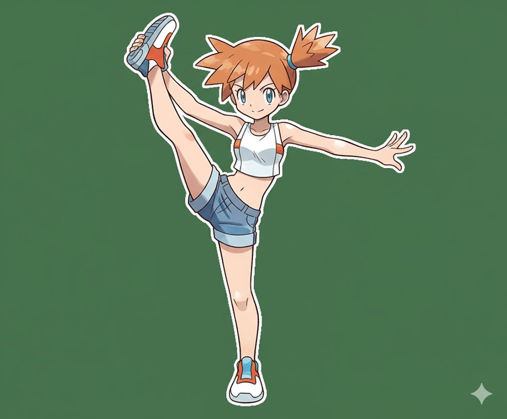 1girlbare armsblue eyesblue shortsclosed mouthcrop topdenimdenim shortseyelashesgreen eyeskneepitskneesleg holdleg uplooking at viewermidriffnavelorange hairoutstretched armsponytailshirtshoesshort hairshort shortsshortsside ponytailsleevelesssleeveless shirtsmilesneakerssolosparklesplitsplit mouthstandingstanding on one legstanding splitwhite shirt