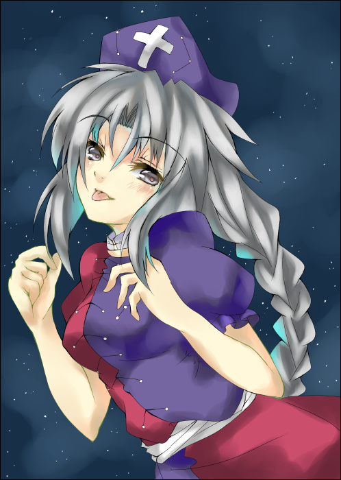 :p1girlblue eyesblushbraiddressfemale focushatlong hairlooking at viewernurse cappuffy short sleevespuffy sleevesshort sleevessingle braidskysolostar (sky)starry skytonguetongue outupper bodyvery long hair