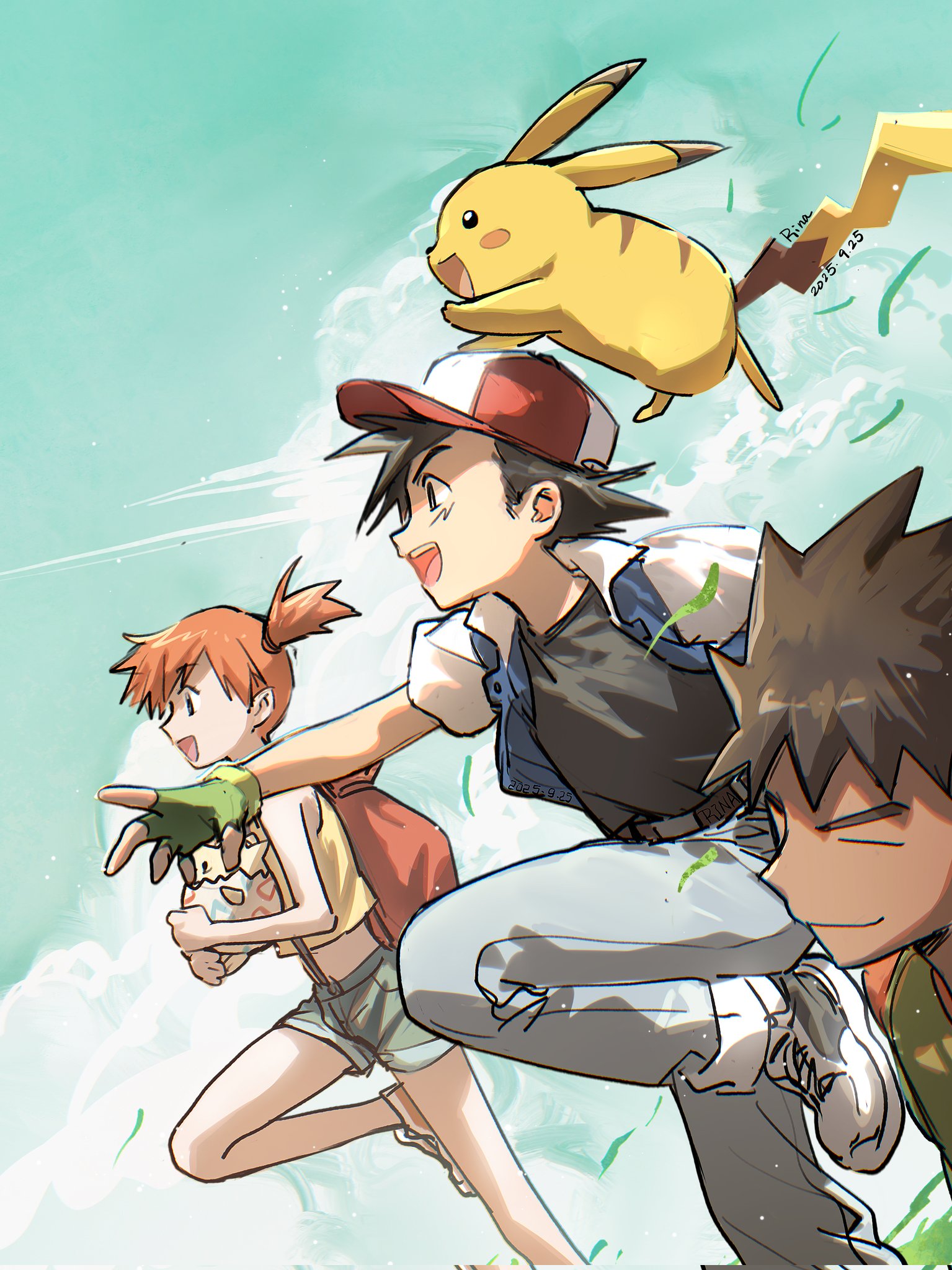 :d1girl2boysbackpackbagbaseball capbeltblack hairblack shirtblue jacketbrown beltbrown hairclosed eyesclosed mouthclouddaydenimfingerless glovesgen 1 pokemongen 2 pokemonglovesgrassgreen glovesgreen shortshatholdingholding pokemonjacketleg upmultiple boysopen clothesopen jacketopen mouthorange hairoutdoorspantspokemon (creature)ponytailrunningshirtshoesshort hairshort sleevesshortsside ponytailskysleevelesssleeveless jacketsmilesneakersspiked hairsuspendersteethtongueupper teeth onlyyellow shirt