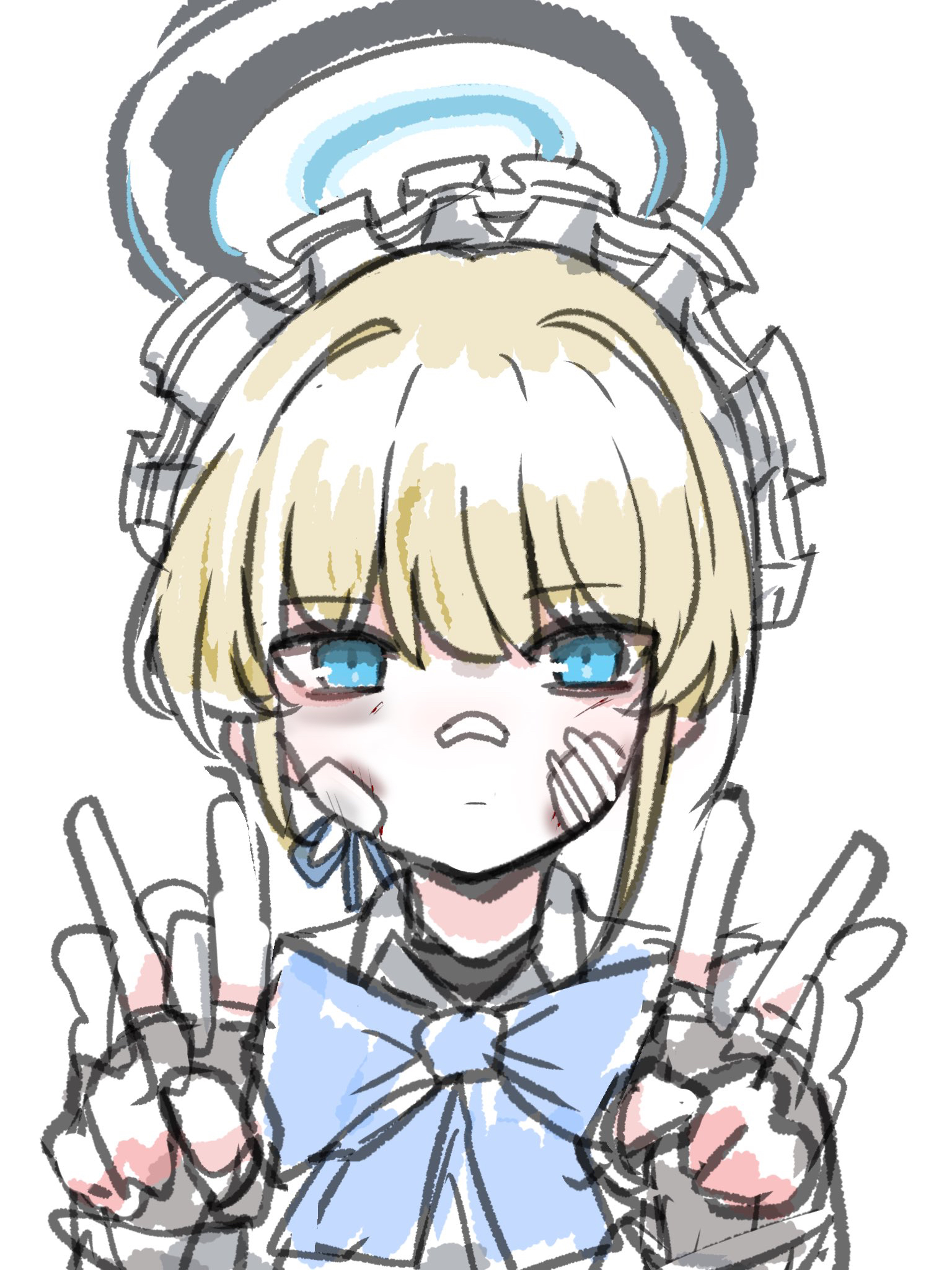 1girlblack dressblack glovesblonde hairblue bowblue eyesbowbruiseclosed mouthdouble vdressfingerless glovesgloveshair between eyeshalohands upinjurylooking at viewermaidmaid headdressshort hairsimple backgroundsketchsoloupper bodyvwhite background