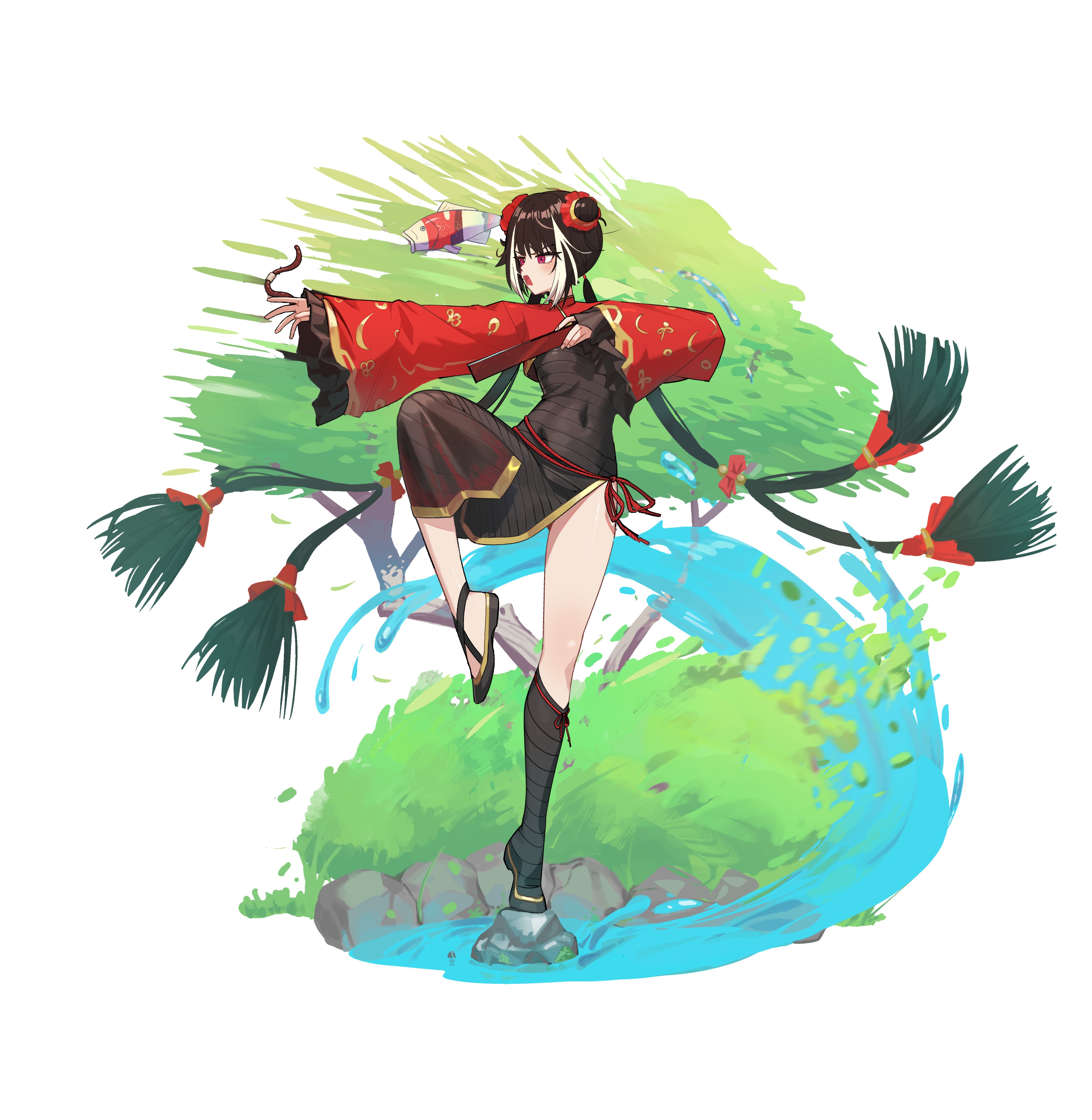 1girlblack dressblack hairblack shoesbreastschinese clothescovered naveldouble bundressfishfull bodyhair bunlong hairlong sleeveslooking to the sidemulticolored hairopen mouthpink eyesred shrugrope beltshoesshrug (clothing)simple backgroundsolostandingstanding on one legstreaked hairtwintailswaterwhite backgroundwhite streaksworm