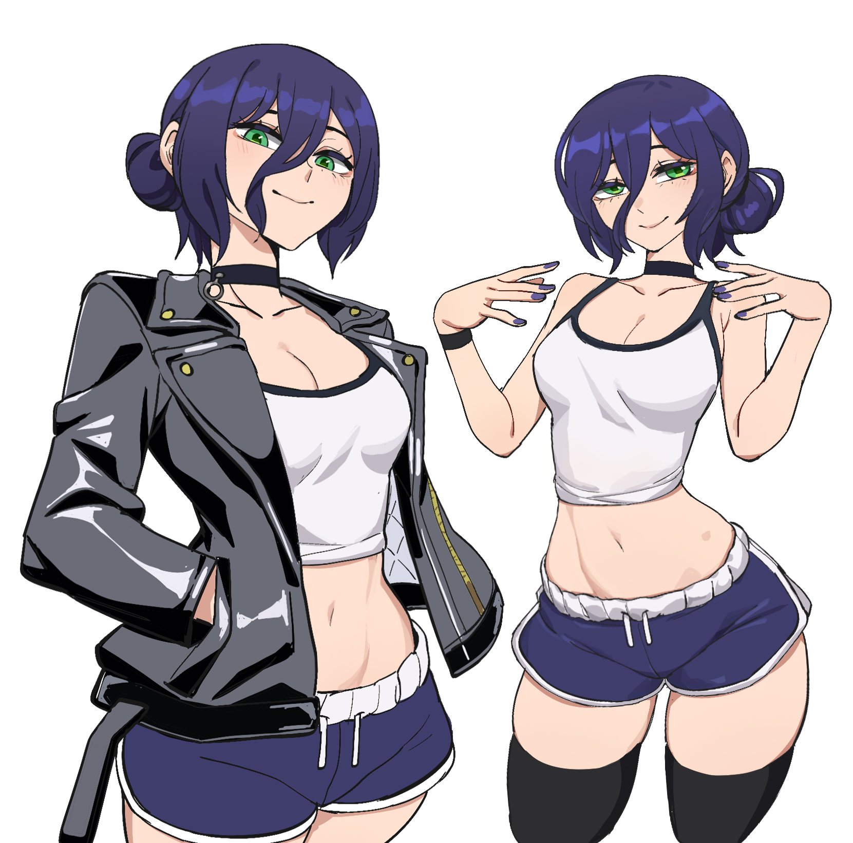 1girlbellyblack chokerchokerhair bunjacketopen clothesopen jacketpull cordshirtsingle hair bunsleevelesssleeveless shirtsolo
