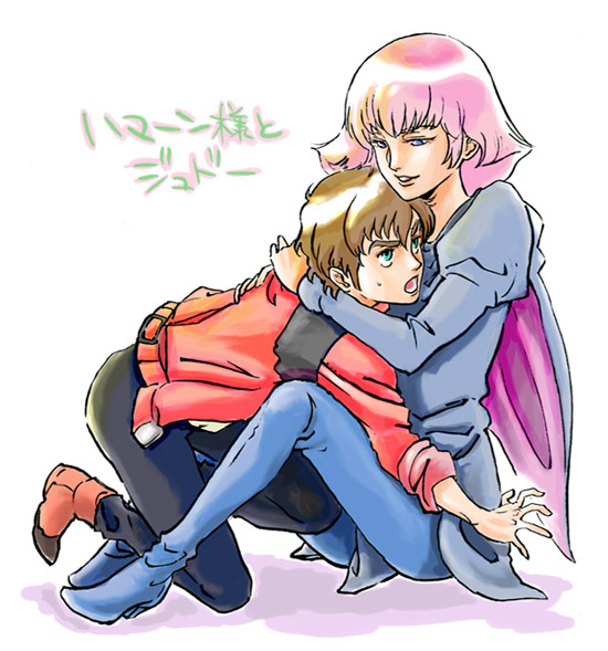 1boy1girlbootsbrown hairdressgreen eyesheterohugjacketjapanese textlipslong sleevesopen mouthpantsparted lipspink hairpuffy sleevespurple eyesred jacketshadowshoesshort dresssimple backgroundsittingsmilesweatdroptext focuswhite background
