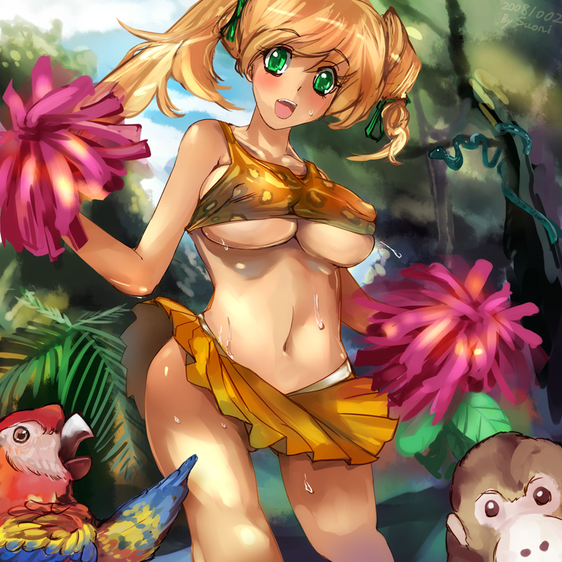 1girlblonde hairbreastscheerleaderfemale focusgreen eyesjunglelarge breastslong hairnaturepom pom (cheerleading)skirtsolosweattwintailsunderboob