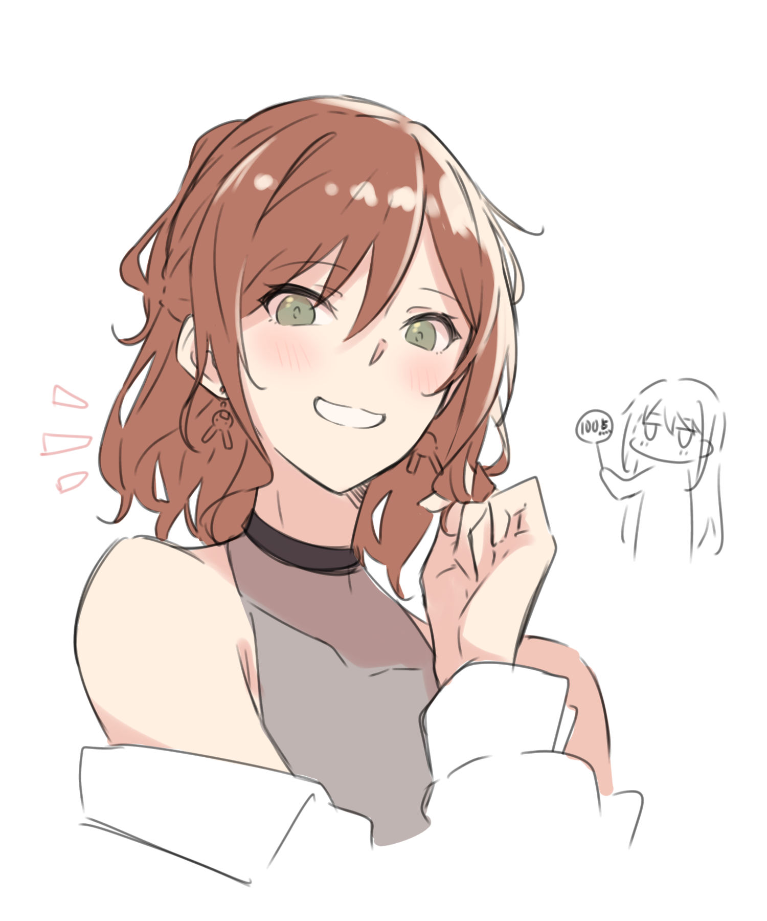 notamaru 2, vrchat, character request, commentary request, highres, 1girl, black ribbon, blue dress, blue eyes, blue hat, blunt bangs, blush, breasts, cleavage, cleavage cutout, clothing cutout, collared dress, double-parted bangs, dress, grey hair, hair between eyes, hand up, hat, large breasts, looking at viewer, neck ribbon, parted lips, portrait, ribbon, short hair, short sleeves, simple background, solo, striped clothes, striped dress, w, white background, wrist cuffs