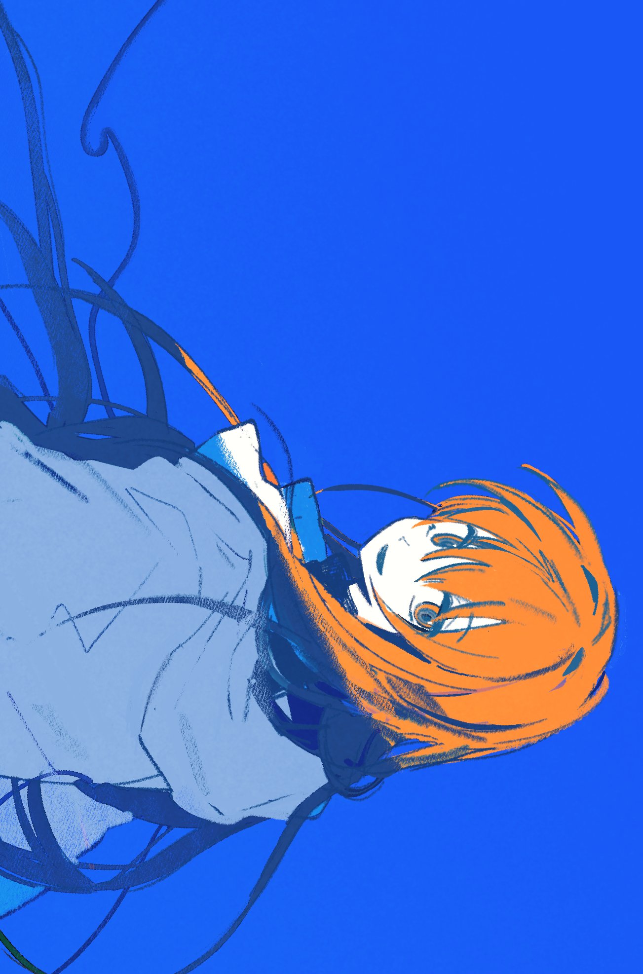 1girlblue backgroundblue coatcoathair between eyeshoodhood downhooded coatlong hairlong sleeveslooking at viewerlooking to the sideopen mouthorange eyesorange hairshirtsidewayssmilesoloturtleneckupper bodyvery long hair