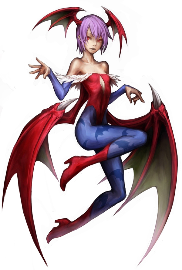 1girlanimal printbat printbat wingsblue pantyhosedemon girlelbow glovesfemale focusgloveshead wingshotpotleotardnabepantyhoseprint pantyhosepurple hairred eyesred leotardshort hairsolowings