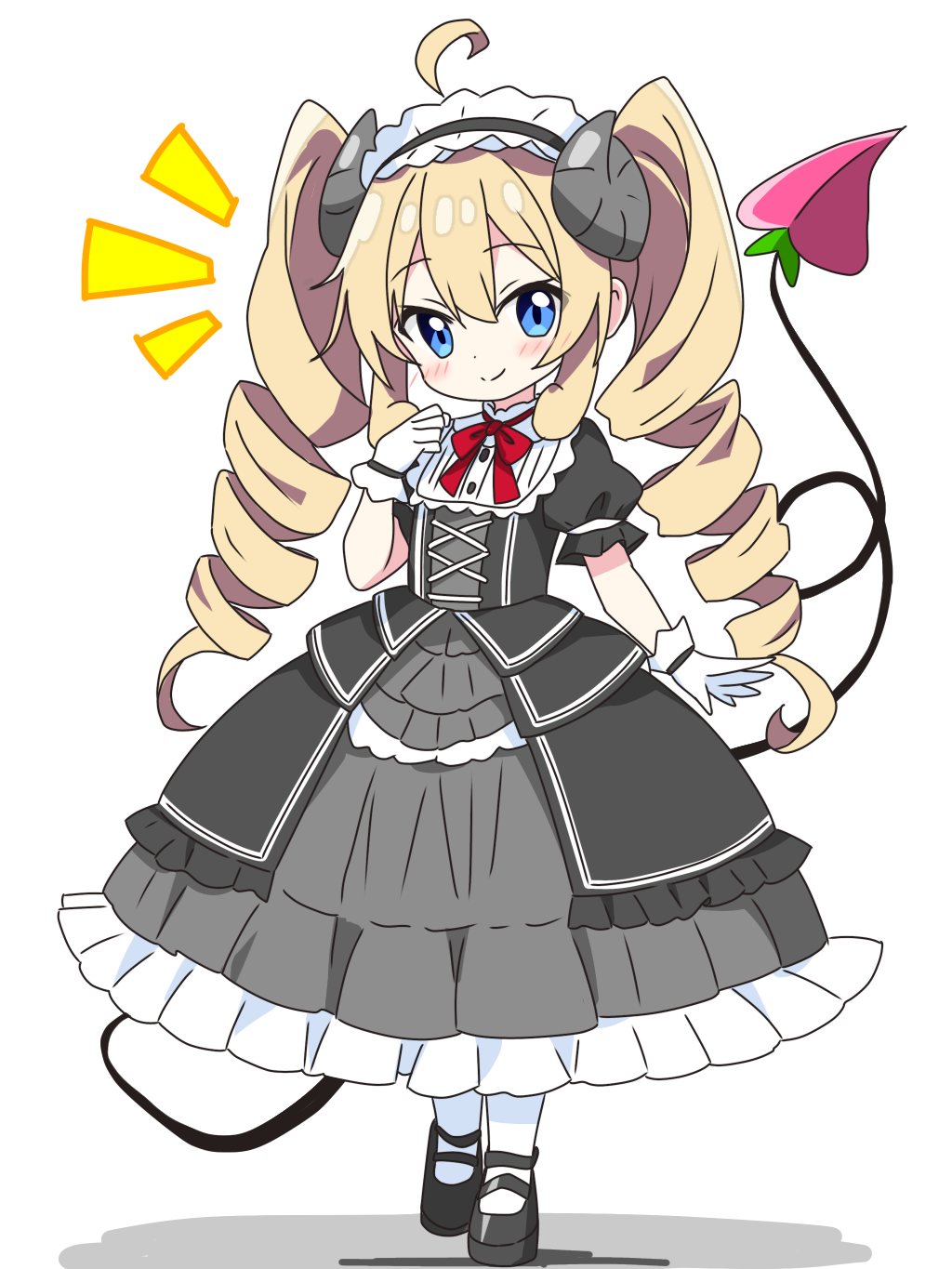 1girlahogeblack dressblack hairbandblack shoesblonde hairblue eyesblushclosed mouthcurled hornsdemon girldemon taildot nosedressdrill hairfrilled dressfrilled hairbandfrillsfull bodyglovesgrey hornshairbandhornslong hairlooking at viewerpantyhoseshoesshort sleevessidelockssimple backgroundsmilesolostandingtailtwin drillstwintailswhite backgroundwhite gloveswhite pantyhose