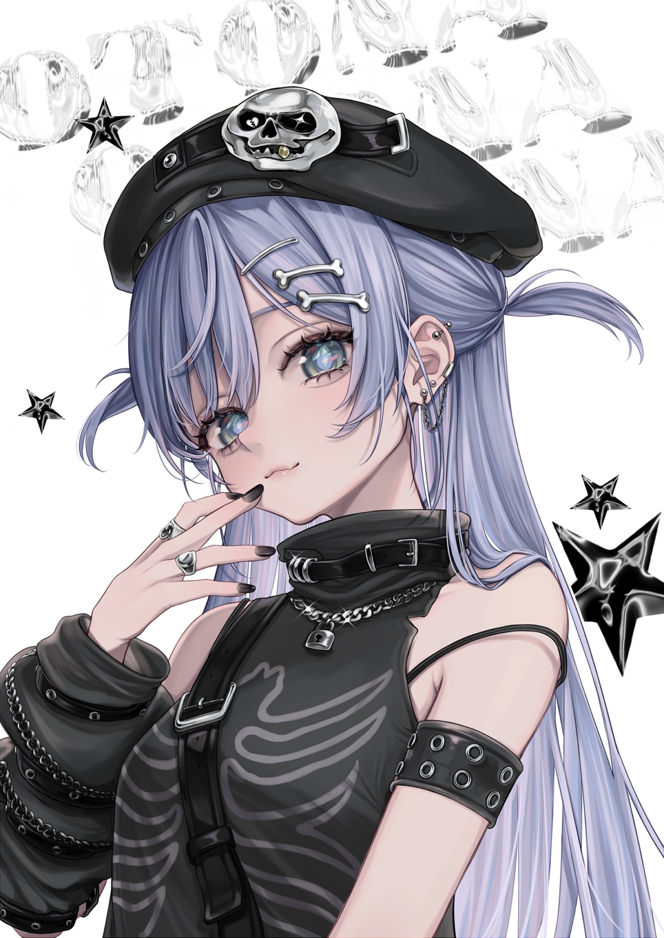 1girlarm warmersarmletberetblack arm warmersblack hatblack nailsblack shirtblue eyesblue hairbone hair ornamentchainchain necklaceear piercingearringshair ornamenthaircliphatjewelrylong hairlooking at viewernail polishnecklacepiercingringshirtsimple backgroundsleevelesssleeveless shirtsmilesolospaghetti strapstar (symbol)strap sliptwo side upupper bodyvirtual youtuberwhite background
