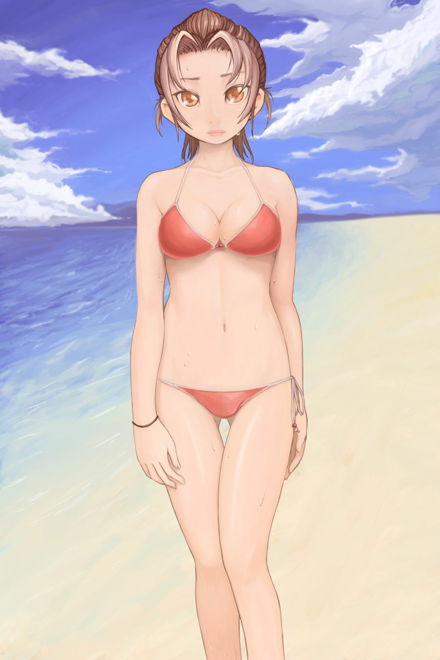 1girlbeachbikinibraceletbreastsbrown eyesbrown haircleavagedayfemale focusjewelrymedium breastsnaveloutdoorsred bikiniside-tie bikini bottomsoloswimsuit