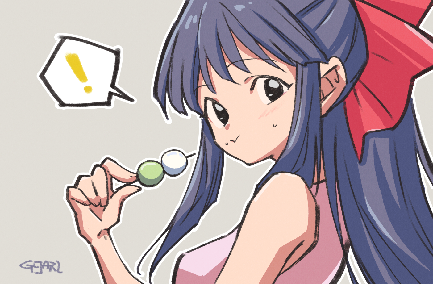 1boy1girlalternate costumeartist nameblue hairblushbowbreastsbrown eyesdresseatinghair ribbonlarge breastslong hairlooking at viewerofficial alternate costumeponytailred bowribbonsideboobsmilesolosurprisedsweatdrop