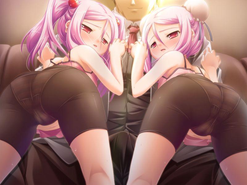 2girlsassbent overbike shortsblushbun covercamisoledouble bunflat chestfrom behindhair bobbleshair bunhair ornamentlolilong hairlooking backmultiple girlsnavelnecktieno braopen mouthpantiespantylinespink hairred eyessee-through clothesshortssiblingssisterssmilestriped clothesstriped pantiessweattake your picktwinstwintailsunderwear