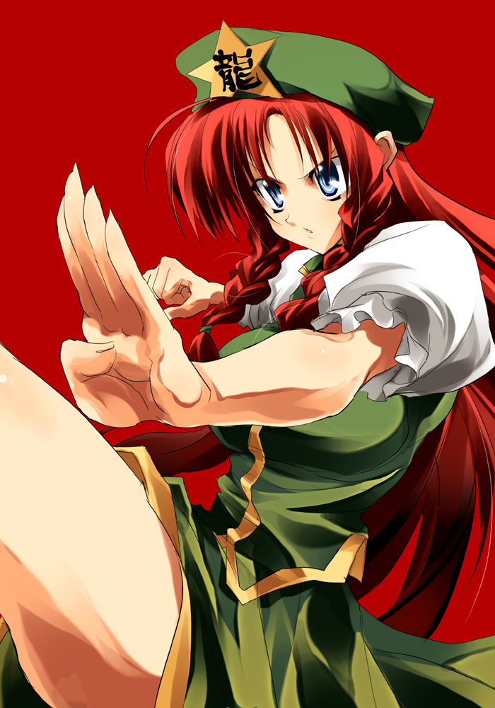 1girlahogeberetblue eyesbraidbreastschina dresschinese clothesclenched handdressfemale focusfighting stancefingernailshatlarge breastsleg uplong fingernailslong hairopen mouthred hairsimple backgroundsolostar (symbol)thighstwin braidsvery long hair