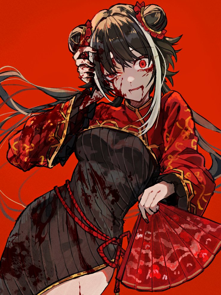 damao (kiwa777), eri (blue archive), blue archive, 1girl, black skirt, blush, bow, bowtie, braid, breasts, breasts out, closed mouth, large breasts, long hair, long sleeves, looking at viewer, nipples, no bra, open clothes, open shirt, pink background, red bow, red bowtie, shirt, shirt tucked in, side braid, simple background, skirt, speech bubble, thought bubble, white background, white hair, white shirt