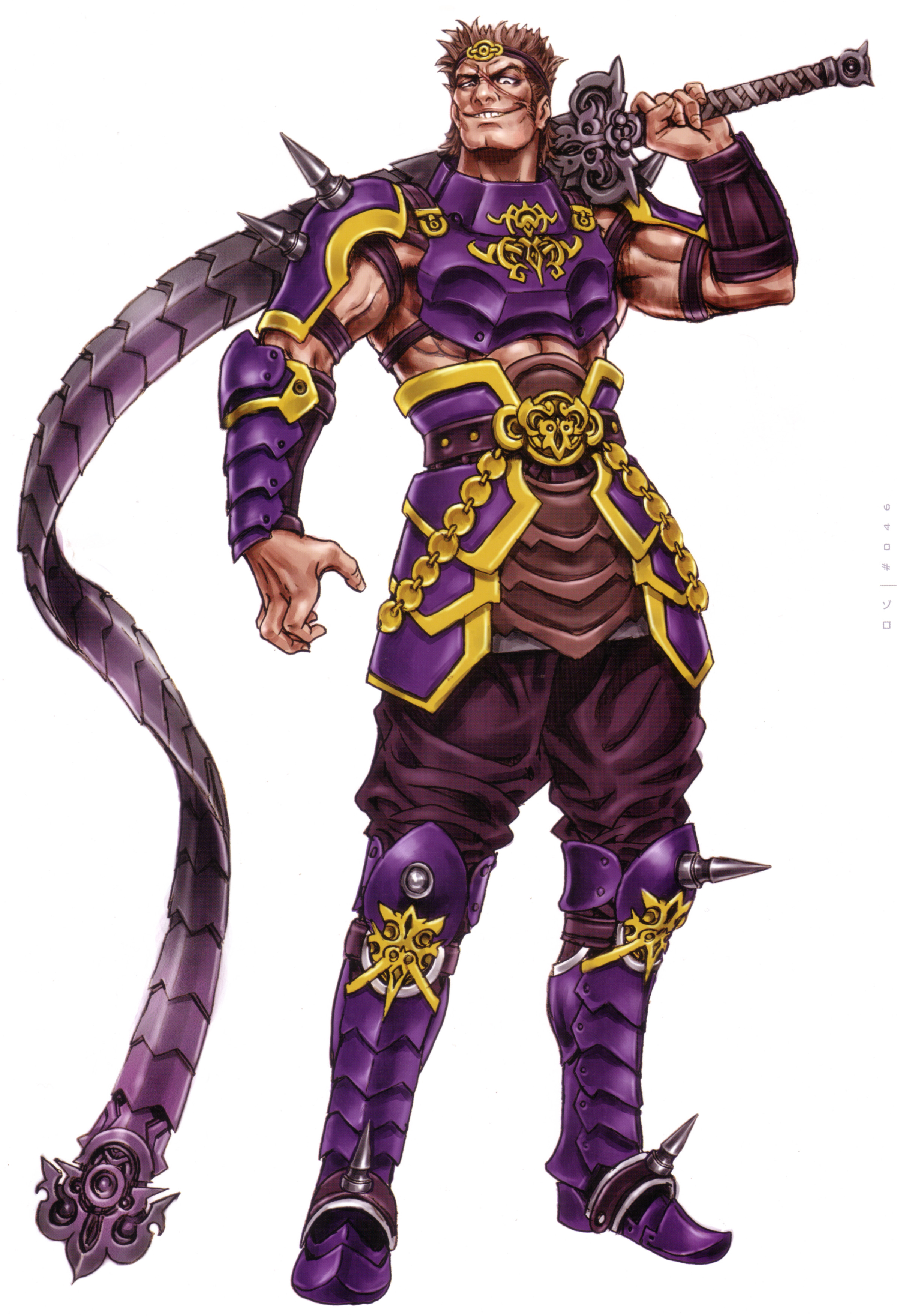 1boyabsarmorbicepsfauldsfull bodygorgetgreavesholdingholding swordholding weaponmale focuspauldronspurple armorshoulder armorshoulder spikessimple backgroundsolospiked hairspikesstandingswordtopless malev-shaped eyebrowsweaponwhite background