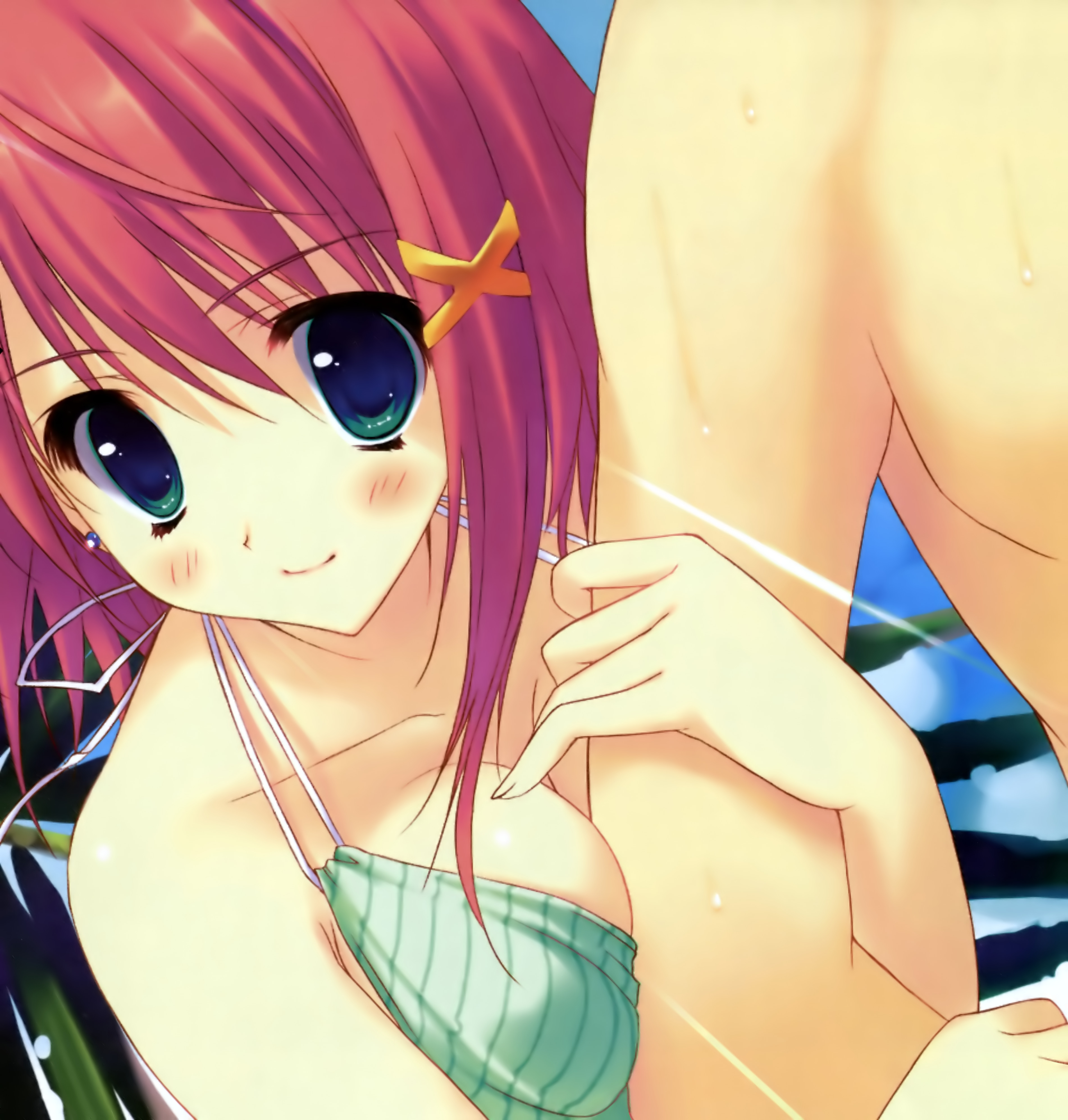 cornelia li britannia, euphemia li britannia, code geass, artist request, 00s, 2girls, bare legs, bare shoulders, blush, from above, long hair, looking at viewer, looking up, multiple girls, pillow, pink hair, purple eyes, purple hair, short hair, sidelocks, simple background, white background