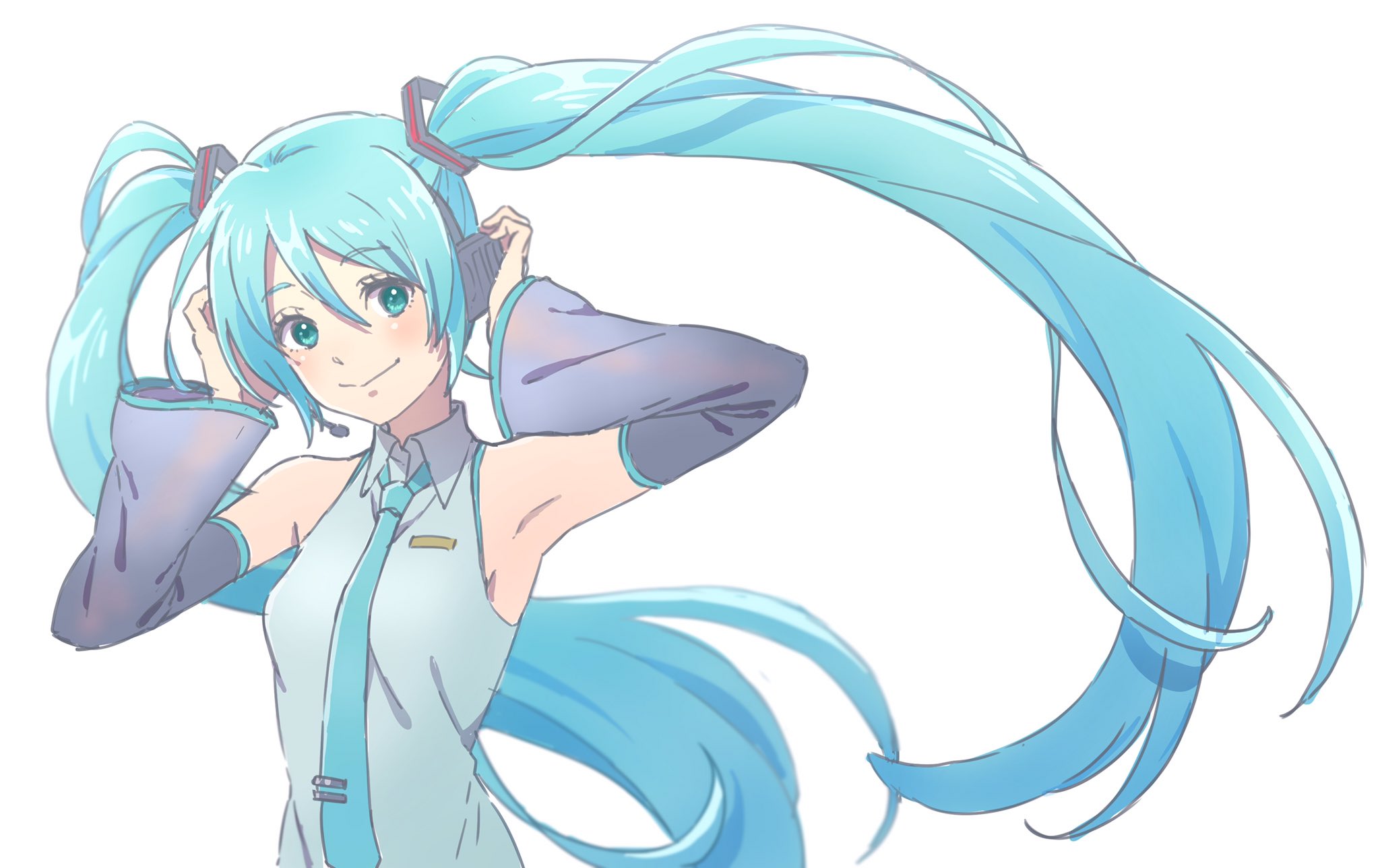 1girlaqua hairclosed mouthdetached sleeveshair between eyeshair ornamentlong hairlooking at viewersimple backgroundsleevelesssmilesolotwintailsvery long hairwhite background