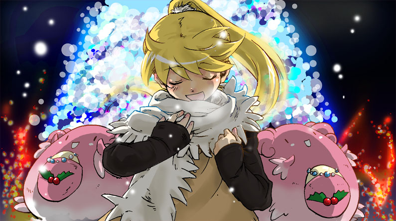 :d1girlblonde hairchristmasgen 2 pokemonhappylong hairopen mouthpokemon (creature)ponytailscarfsmile