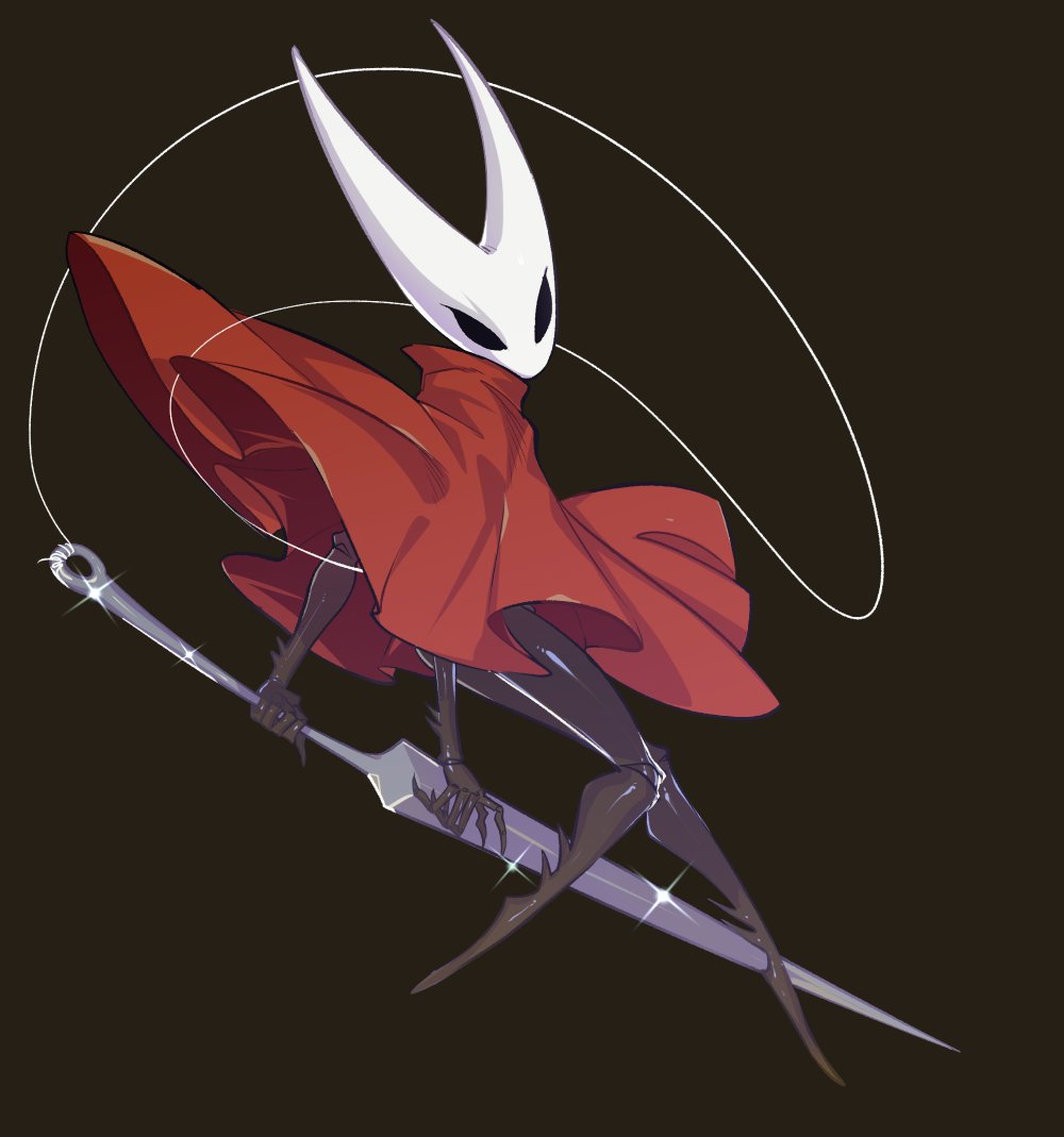 1girlarthropod girlblack backgroundblack skincloakcolored skindynamic posefrom sidefull bodyholdingholding weaponhollow eyesleft-handedlooking at viewerlooking backneedle (hollow knight)red cloaksimple backgroundsolothreadturning aroundturning headweapon