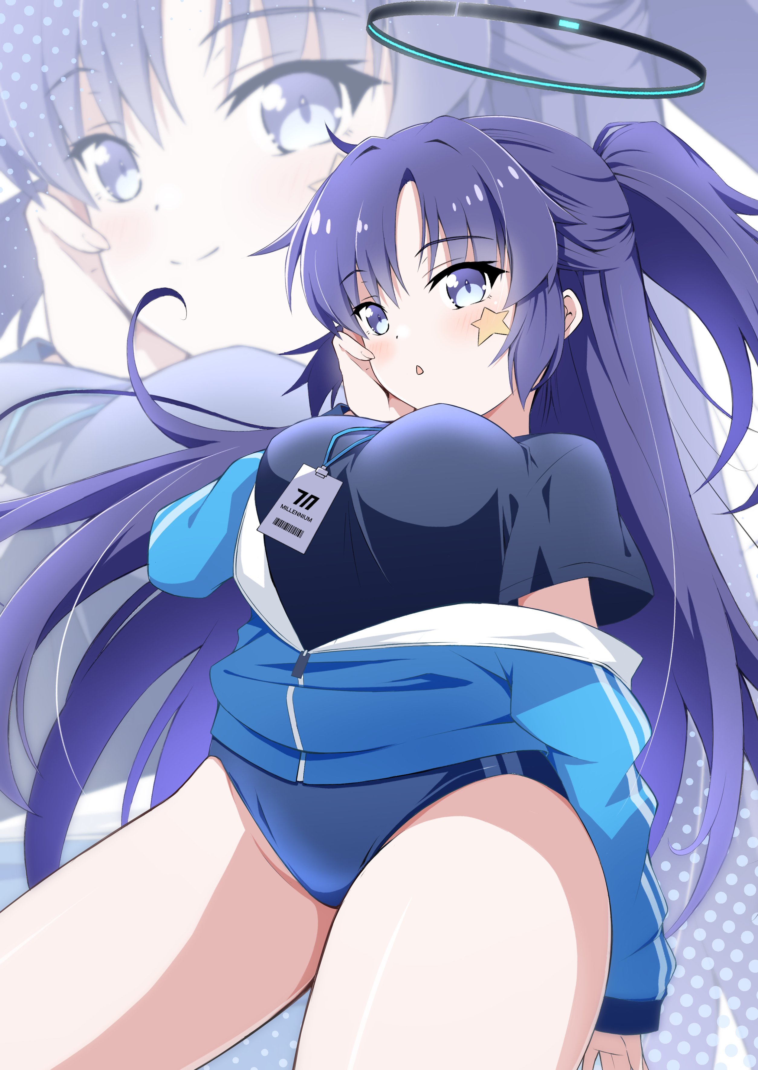 1girlblue burumaburumagym shirtgym uniformhalohand on own cheekhand on own faceid cardjacketjacket partially removedlanyardlong hairlooking at viewermechanical halomillennium science school logoofficial alternate costumepartially unzippedpurple eyespurple hairshirtsmilesolostar (symbol)star stickerstickersticker on facetrack jacketzoom layer