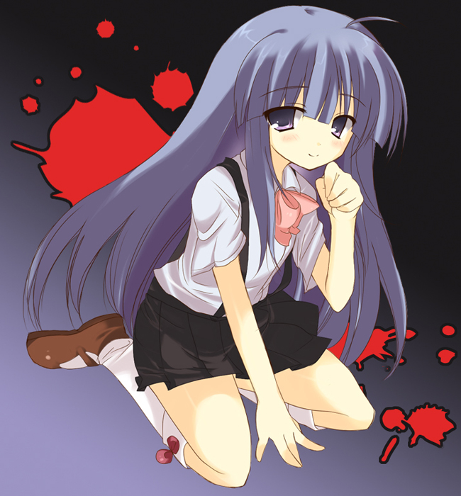 00s1girlahogeblue hairbowfemale focuskneehighskneelinglong hairpink bowpurple eyesskirtsockssolosuspender skirtsuspenders