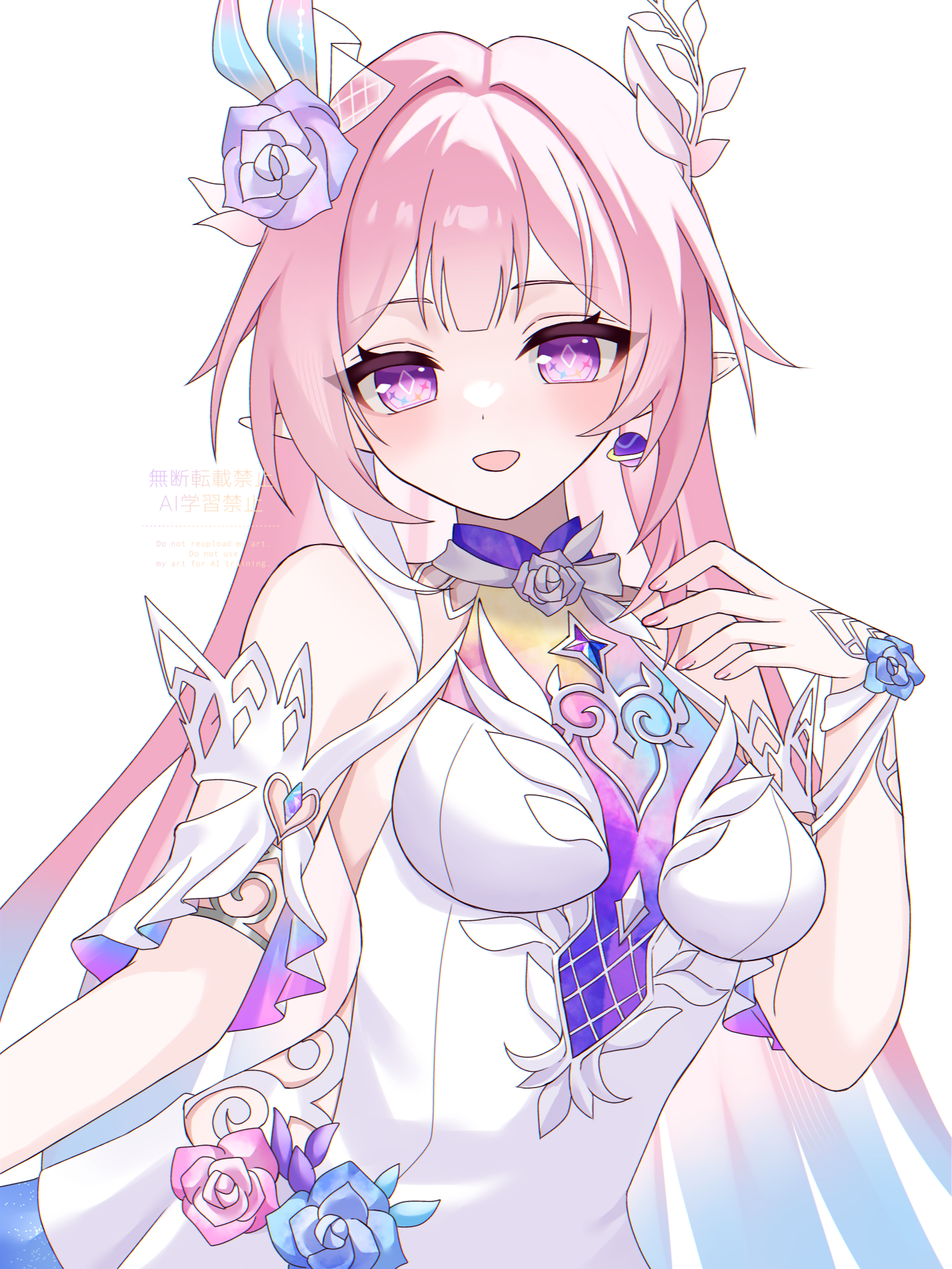 shu (arknights), arknights, chinese commentary, commentary request, highres, 1girl, bare shoulders, beads, blonde hair, bohe nai lu, closed mouth, colored extremities, dragon girl, dragon horns, earrings, grey eyes, grey hair, grey jacket, hair between eyes, hair intakes, holding, holding plant, horns, jacket, jewelry, long sleeves, looking at viewer, multicolored hair, necklace, off shoulder, plant, pointy ears, purple hair, red pupils, simple background, smile, solo, upper body, wheat, white background