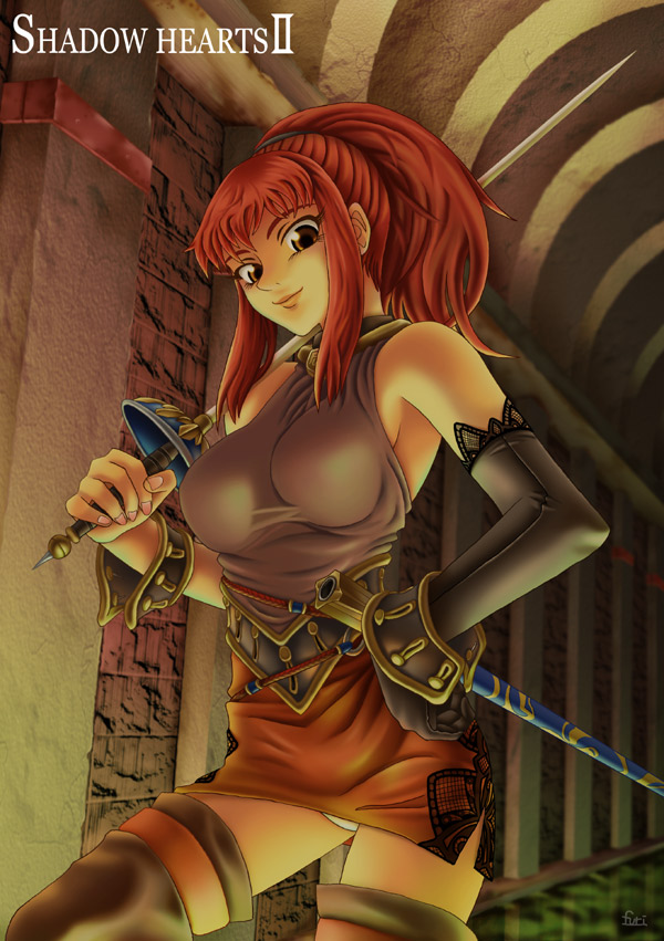 1girlarmpitsbreastsbrown eyeselbow glovesfemale focusgloveshalterneckhand on own hiphip focuslarge breastslong hairminiskirtnail polishpantiespantyshotpencil skirtponytailred hairropesheathsingle elbow glovesingle gloveskirtsmilesoloswordthighhighsunderwearweaponwhite pantieszettai ryouiki
